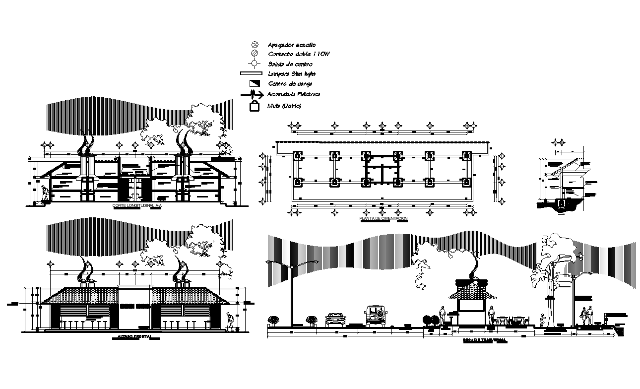 Foundation plan and elevation working plan detail dwg file, with dimension detail, naming detail, street light detail, reinforcement detail, chimney detail with elevation detail, wall section detail, roof elevation detail, landscaping detail with tree and plant detail, etc.