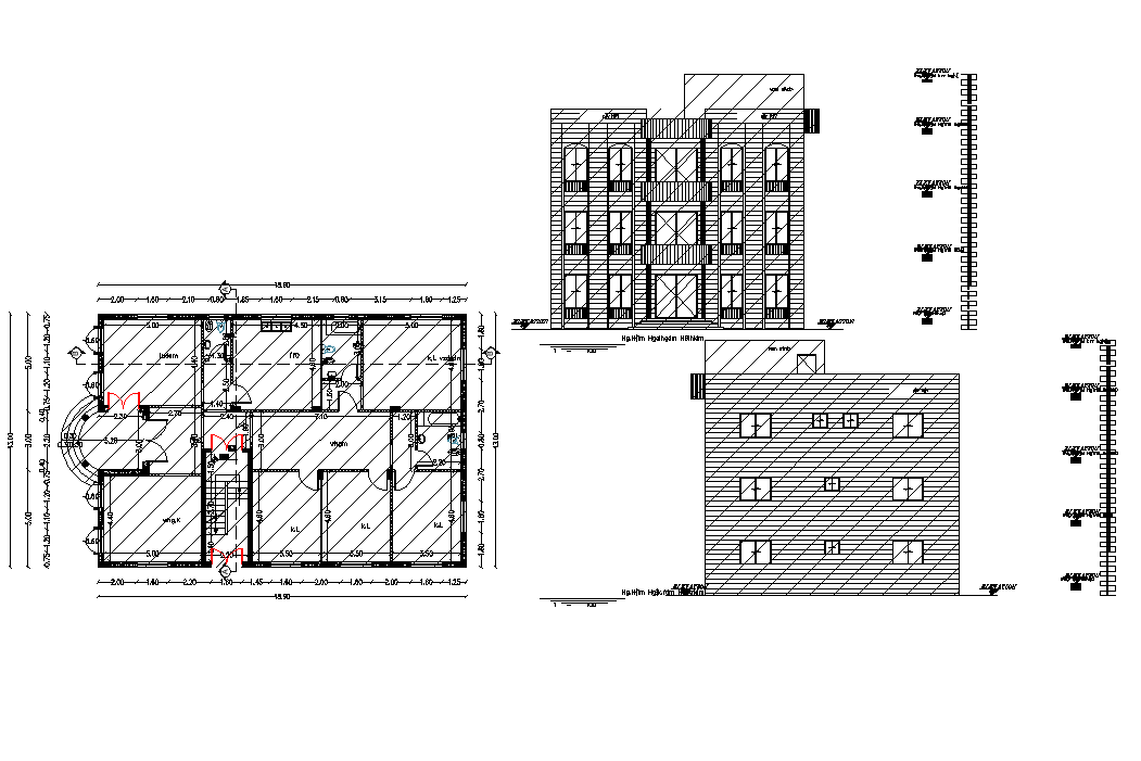 Office plan and elevation detail dwg file, with dimension detail, naming detail, stair detail, front elevation and back elevation detail, furniture detail with door and window detail, reeling detail, tank elevation detail, toilet detail, etc.