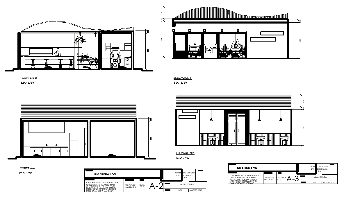 Elevation and section plan detail dwg file, including dimension detail, naming detail, front elevation detail, back elevation detail, section A-A’ detail, section B-B’ detail, furniture detail with chair, table, door and window detail, hidden line plan detail, etc.