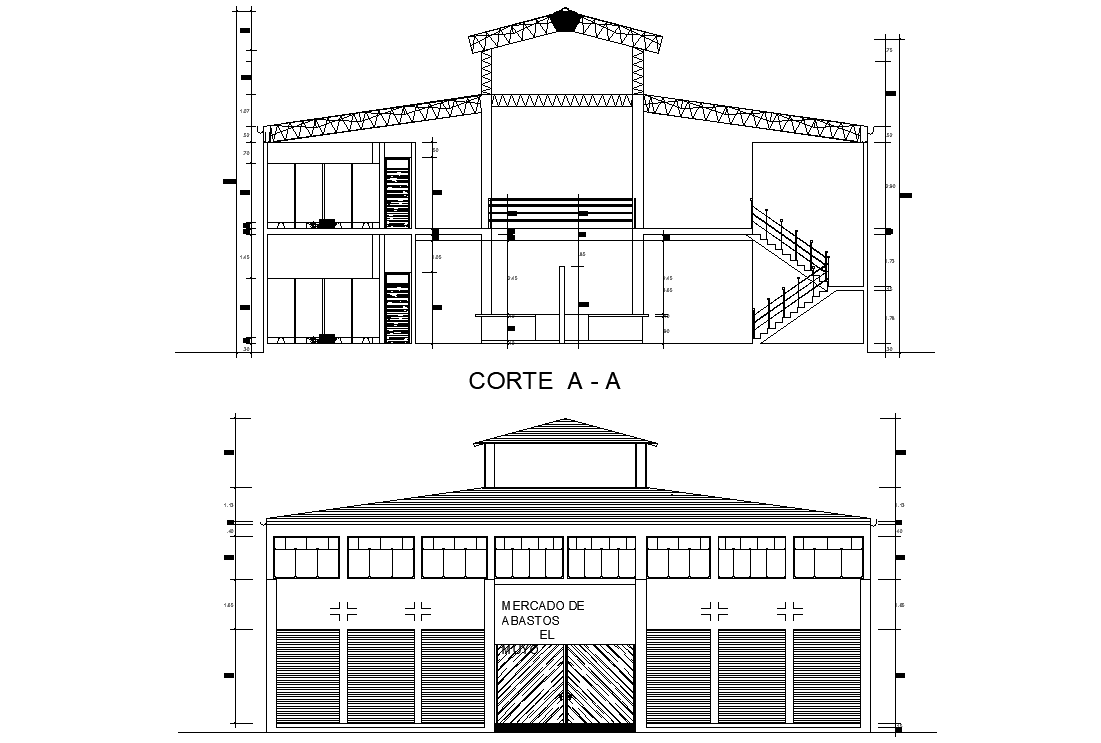 Bungalow section plan detail dwg file, with section A-A’ detail, stair cutting detail, reeling detail, steel structural detail, dimension detail, naming detail, section B-B’ detail, gate detail, etc.