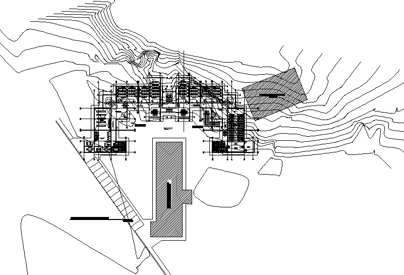 Administration center plan detail dwg file, with dimension detail, naming detail, contour line detail, furniture detail bench, table, door and window detail, hatching detail, etc.