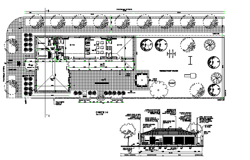 Public Garden detail dwg file, with front elevation detail, dimension detail, naming detail, section line detail, landscaping detail with plant and tree detail, etc.