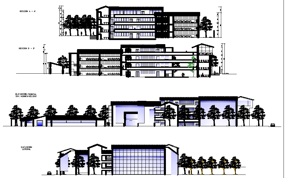 College elevation and section detail dwg file, front elevation detail and lateral elevation detail, section A-A’ detail, section B-B’ detail, dimension detail, both side tree detail, furniture detail with door and window detail, etc.