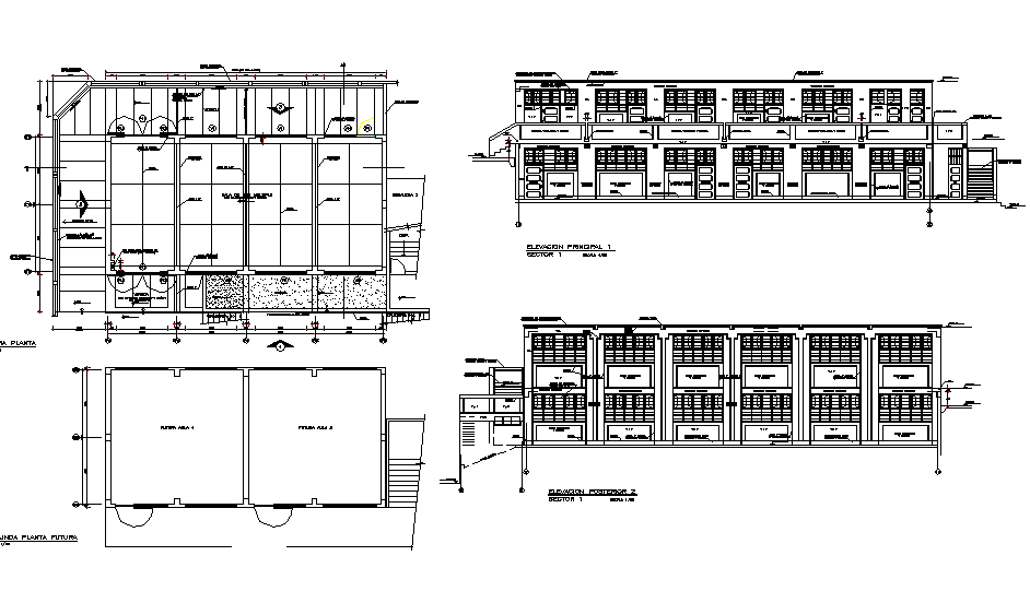 Education college plan and elevation detail dwg file, with centerline detail with numbering detail, dimension detail, stair detail, naming detail, front elevation detail, back elevation detail, etc.