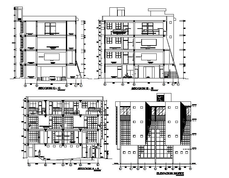 Library elevation and section plan detail dwg file, front elevation detail, section A-A’ detail, section B-B’ detail, section C-C’ detail, centre line plan detail, dimension detail, leveling detail, etc.
