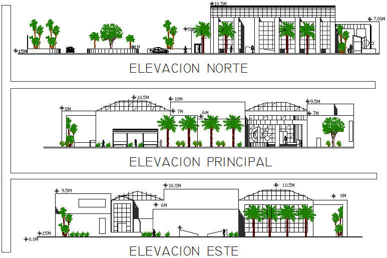 Elevation library detail dwg file, north elevation detail, principal elevation detail, east elevation detail, landscaping detail with tree and plant detail, car parking detail, dimension detail, etc.