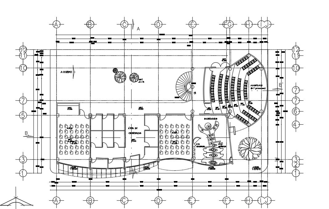 College Classroom detail dwg file, including dimension detail, naming detail, landscaping detail with tree and plant detail, toilet detail, stair detail, furniture detail with chair and table detail, etc.