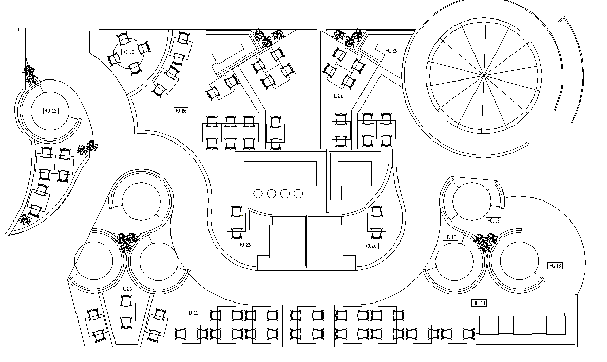 Restaurant layout plan dwg file, top view of a restaurant,big resto , furniture detailing, circular layout plan