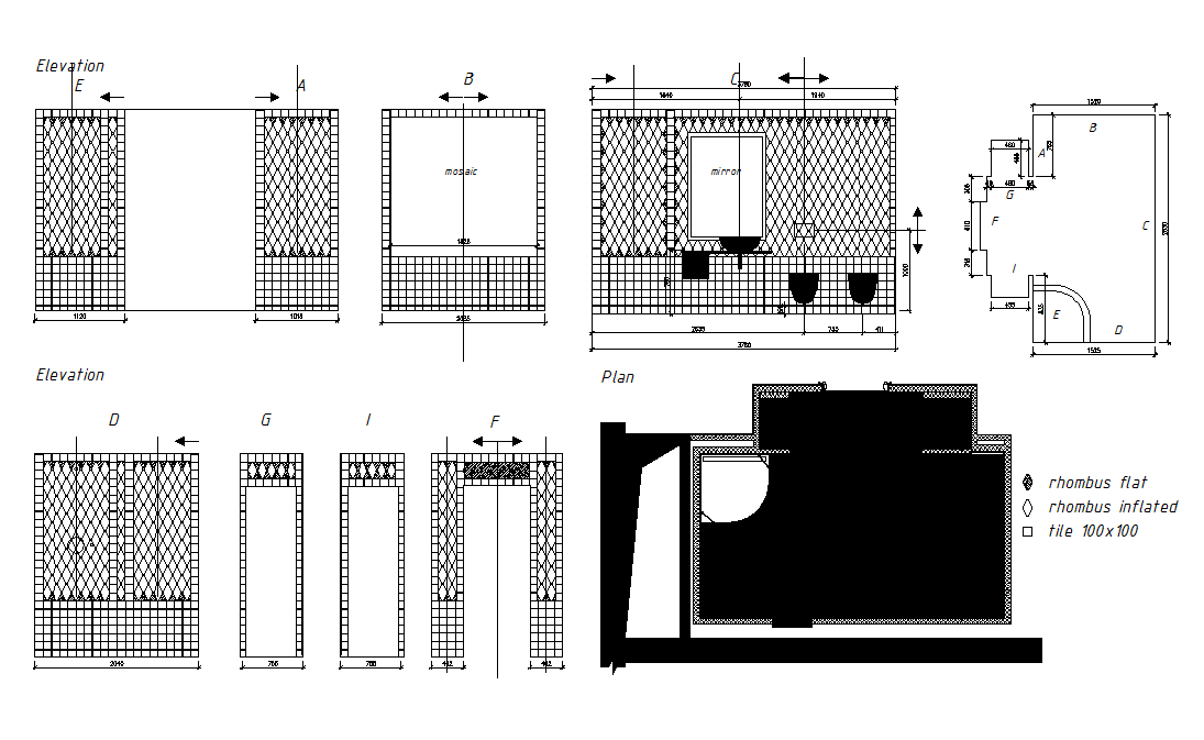 Bathroom elevation design dwg file, here there is sectional elevation of bathroom, wc details, tile detail, fittings and fixtures detail