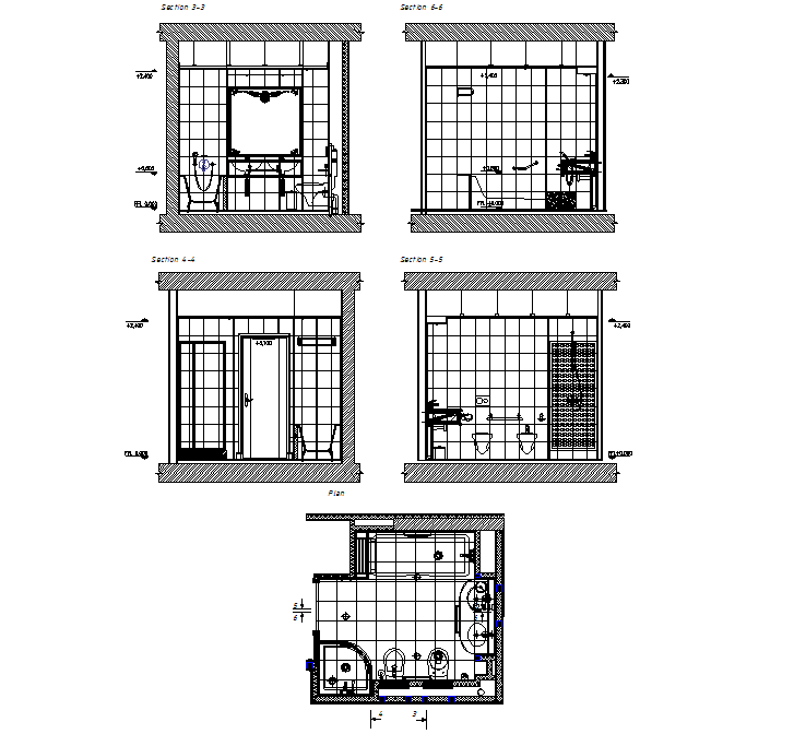 Bathroom elevation design dwg file, here there is sectional elevation of bathroom, wc details, tile detail, fittings and fixtures detail