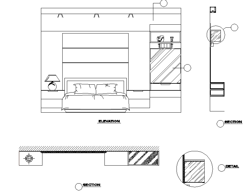 Bedroom elevation and section dwg file, front elevation of bed is shown, with sectional detail of material