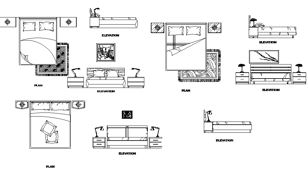 Plan and elevation of beds , side elevation and front elevation of bed , side table, show pieces