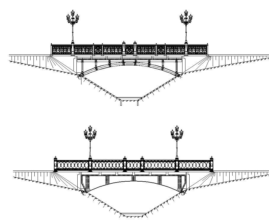 Bridge with street lights elevation dwg file, Side view elevation of a bridge dwg file, long bridge elevation is shown, with modern railing design