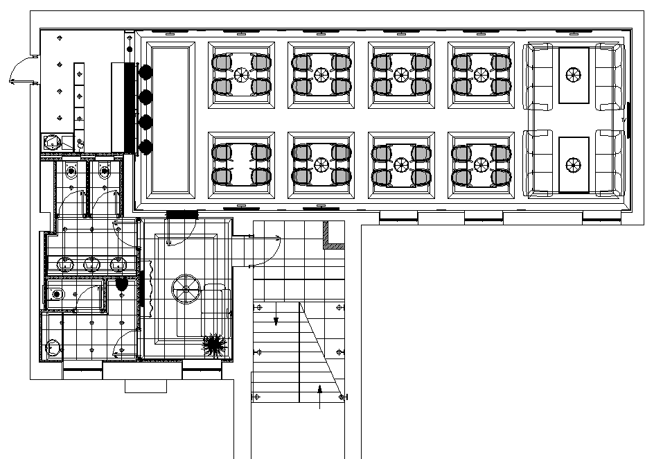 Cafe layout plan dwg file, here there is layout plaan of a cafe, furniture detailing is shown, big cafe design