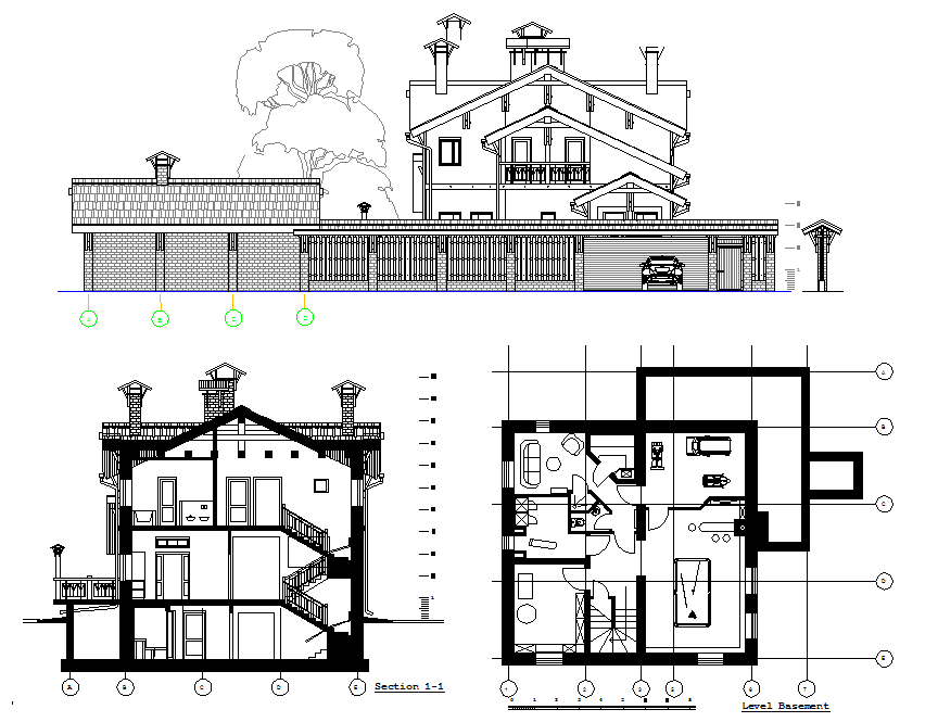 Elevation of villa and church dwg file