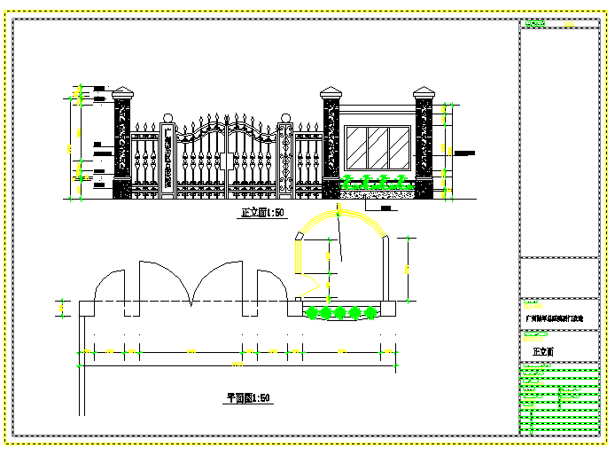 Main Society Gate Design in autocad DWG file, Elevation elevation 1: 50, Side facade 1:50, Floor plan 1:50, Antique white brick.