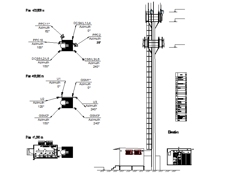 Communication and network signal tower detail, here there is sectional detail of network tower, front elevation and other sectional details are shown