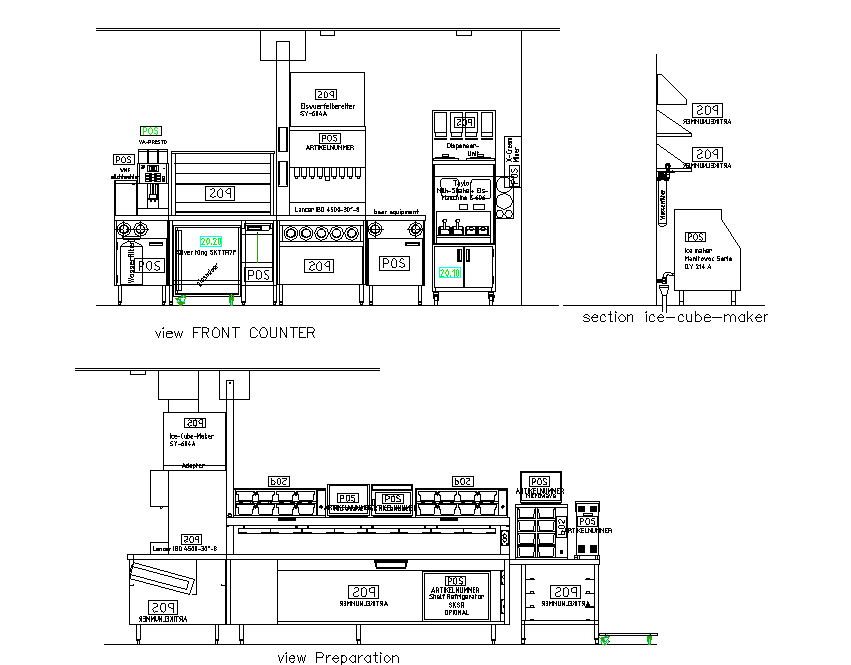 Equipment for industrial kitchen dwg file, here there is front elevation and interior detail of kitchen set up in industrial place