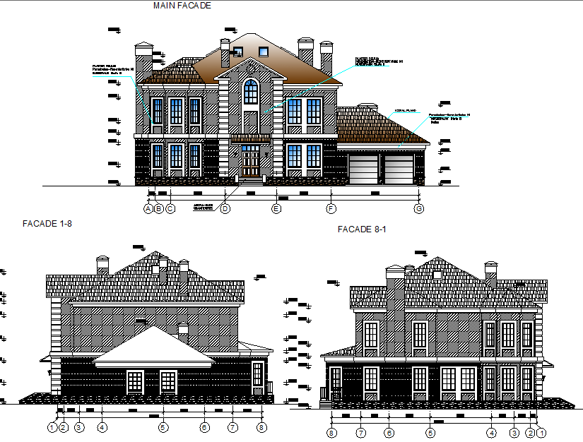 Bungalow elevation dwg file, front view and side view of a bungalow is shown, material detailing, posh bungalow design