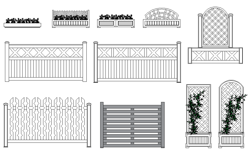 Flower bed and wooden frame dwg file, elevation design of a flower bed design and wooden frame fencing detail