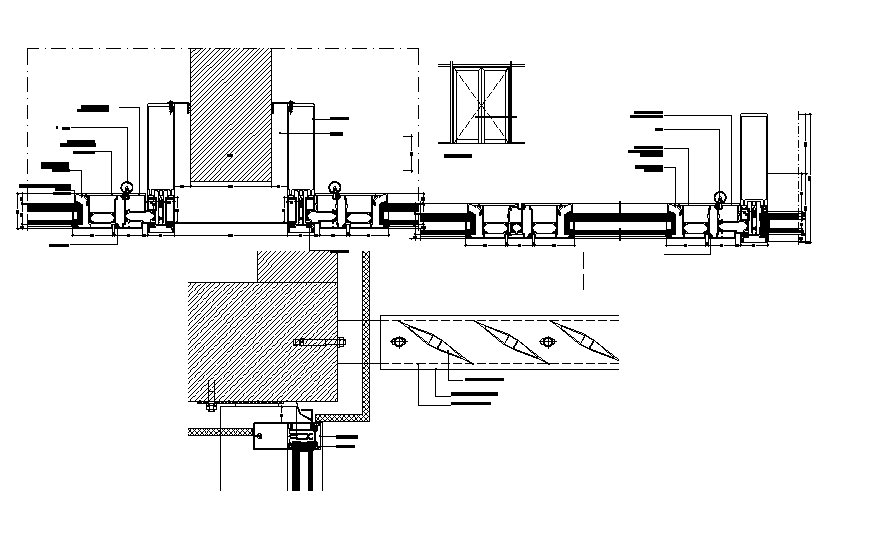 Glass wall system detail dwg file, complete elevation of a wall, with glass detailing, funiture detail in auto caad format