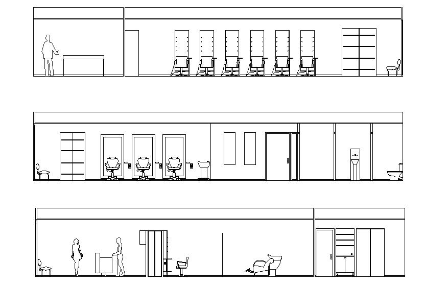 Sectional elevation of saloon layout plan dwg file,reception area is shown, with all saloon furniture, bathroom plan, spacious concept