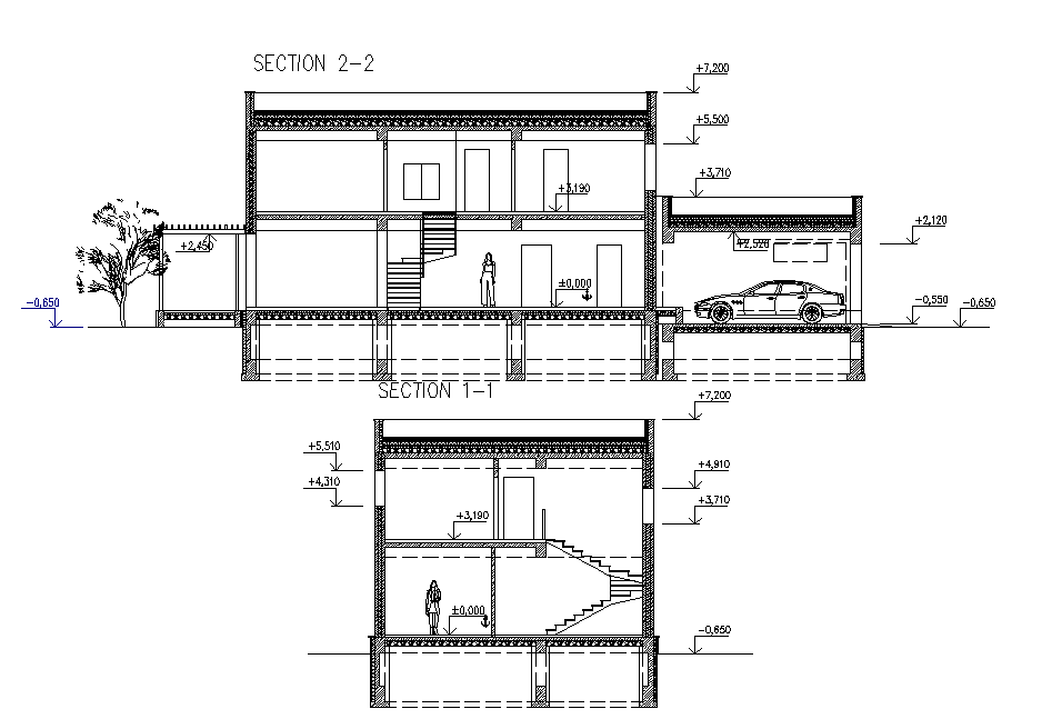 Sectional elevation of house with level detailing dwg file, here there is big house detail, furniture layout , elevation, human figure detail, in autocad format