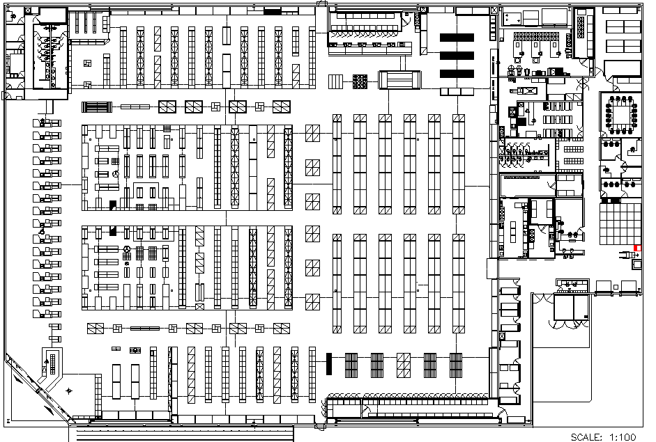Super market architectural plan dwg file, here there is all details of architectural plan, with storage details, dining area, counter , shelves etc