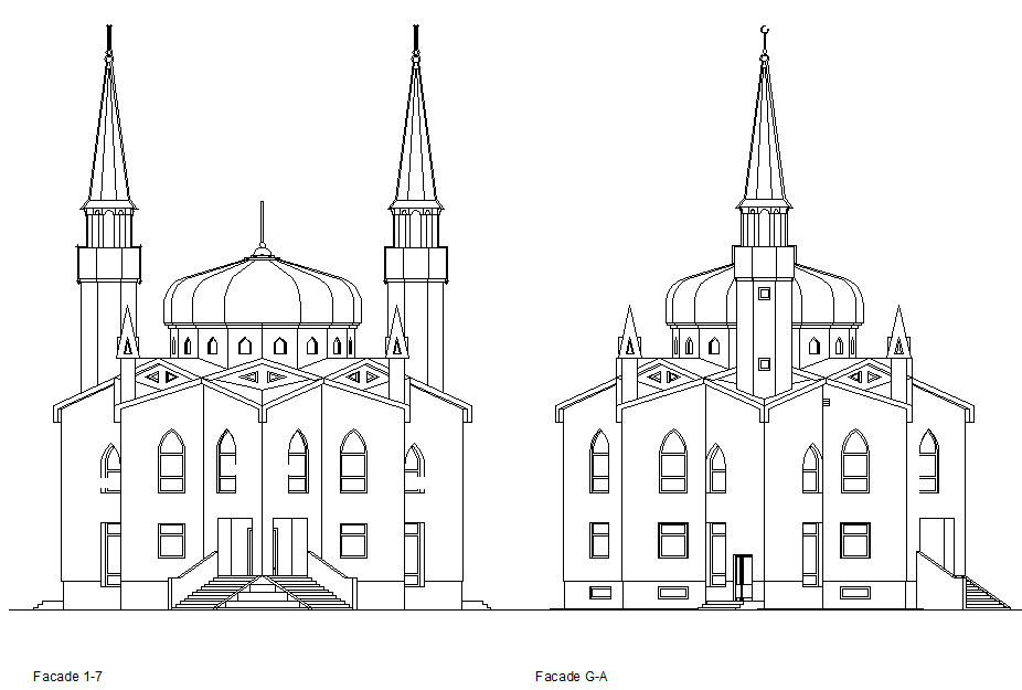 Elevation of a mosque detail , this is worship place elevation detail , front and side elevation in auto cad format