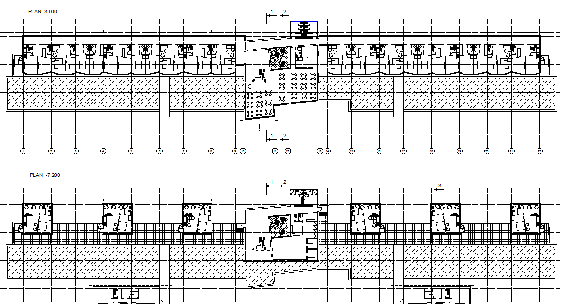 Hotel architectural plan dwg file, top view plan with restaurant in the center and rooms om side, furniture layout plan
