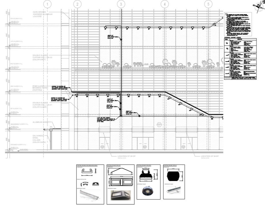 elevation and exterior lighting fixture layout of a corporate building, exterior lighting detail, fixtures, and different types,
