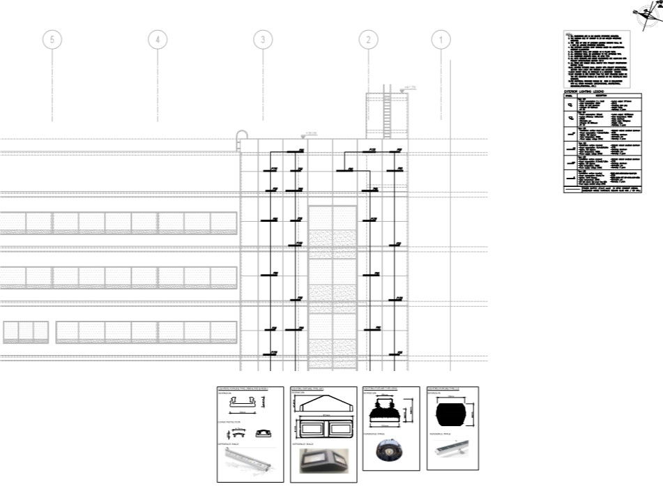 building elevation and exterior lighting pattern detail led light different types, uses, description and detail shown exterior light legend.