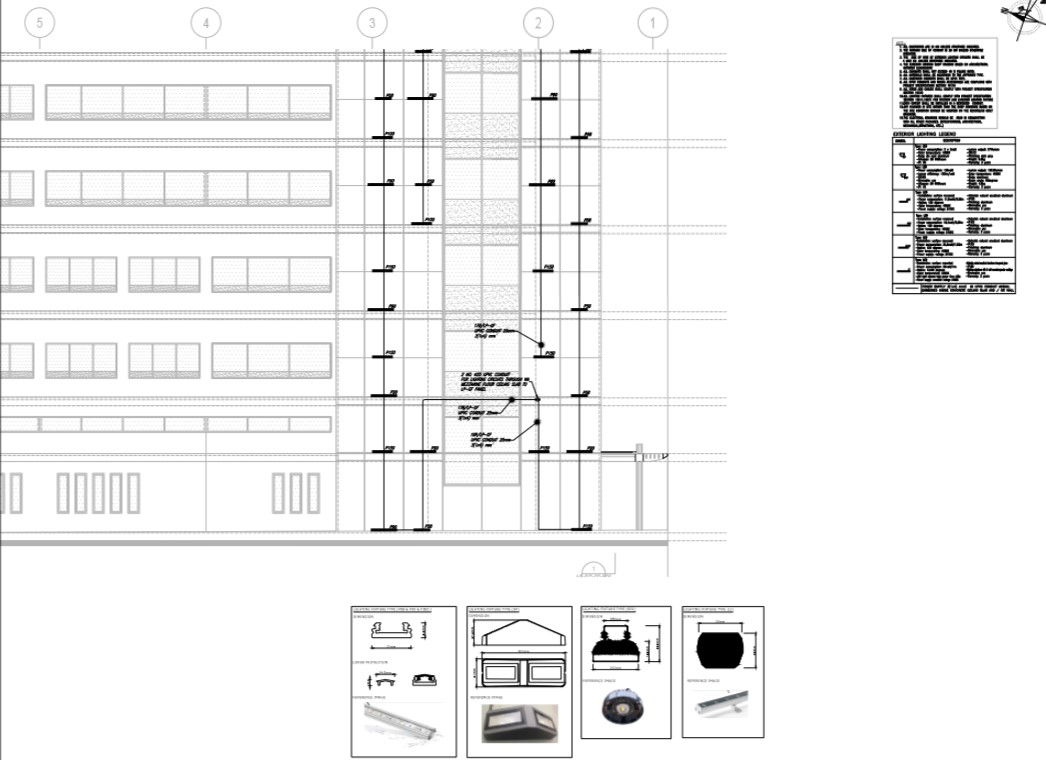 elevation and exterior led lighting installation and specification detail detail of led light fixtures and exterior lighting legend. material and types.