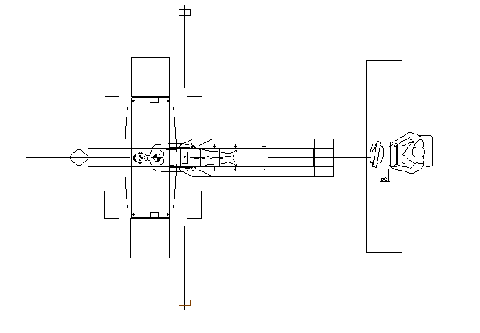 Tomography machine top view dwg file, top view of the machine is shown, with human figure detailing, with doctor table