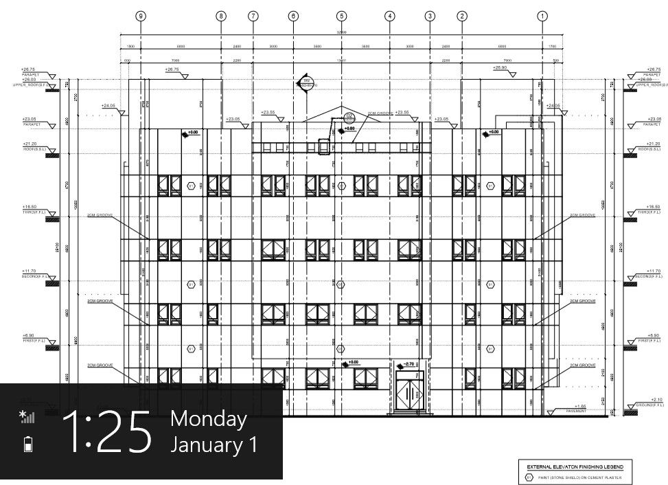institutional building front elevation detail, grooving detail, floor detail with measurement, working detail with the all dimensions and levels.