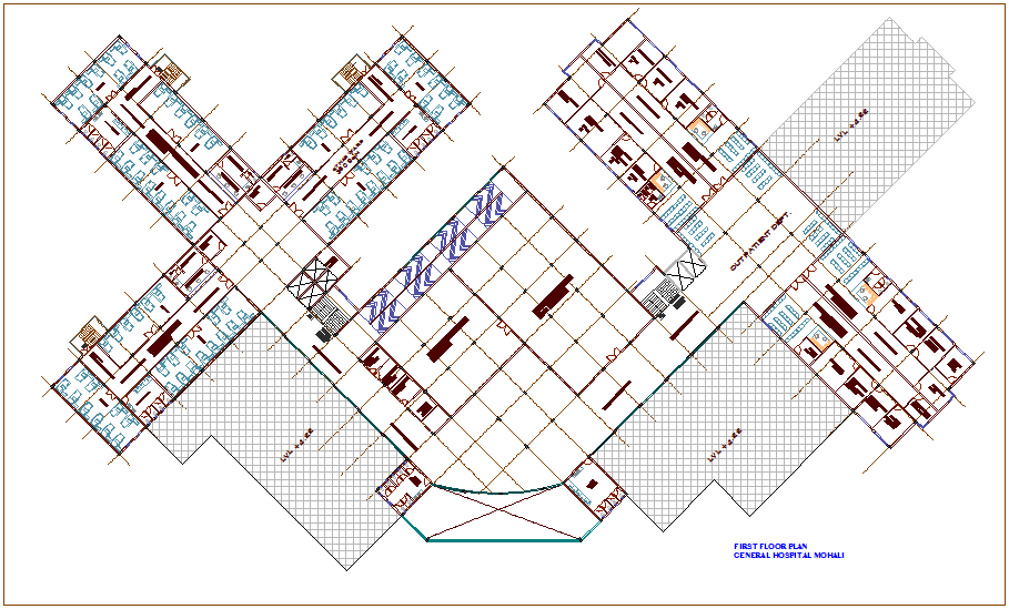 First floor plan of general hospital dwg file in first floor plan with view of area distribution,entry way,corridor view,medical clinic area with consultant room,gynace,