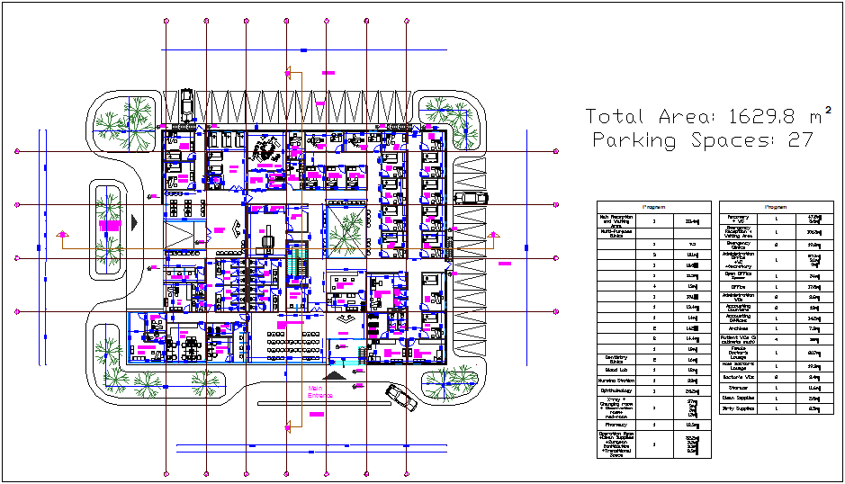 Clinic plan with parking detail dwg file in plan with view of area distribution,main entry,