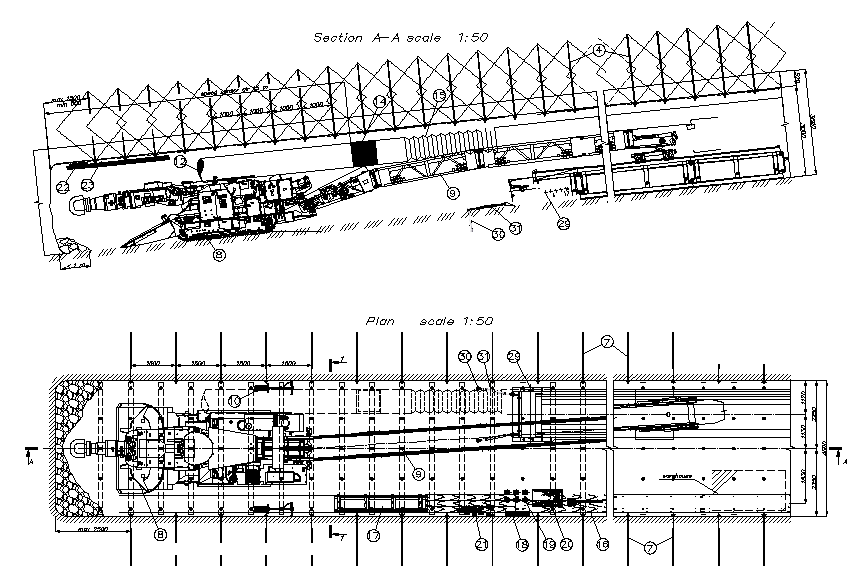 Roadheader top view layout plan dwg file, construction detail of a road project is shown, top view plan in auto cad format