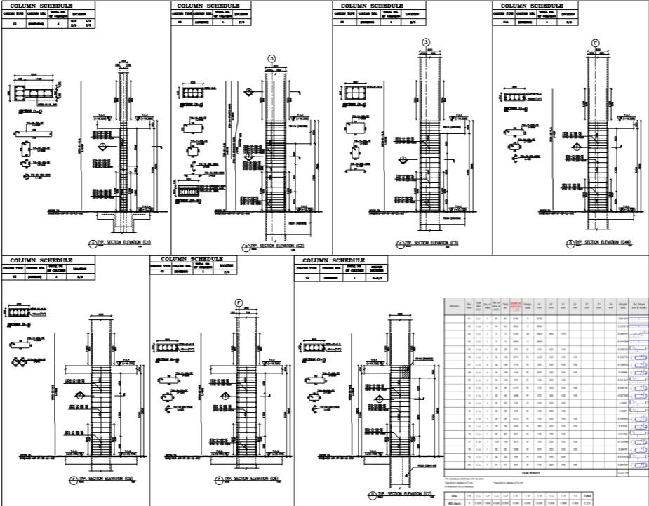 structural detail of column and detail out the schedule of it. structural detail with plan and section with all measurements.