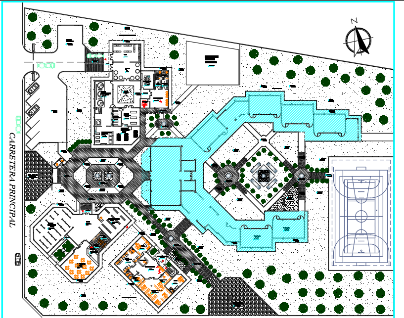 North direction detail dwg file, including car parking detail, landscaping detail with tree and plant detail, game zone detail, stair detail, furniture detail with plant and tree detail, etc.