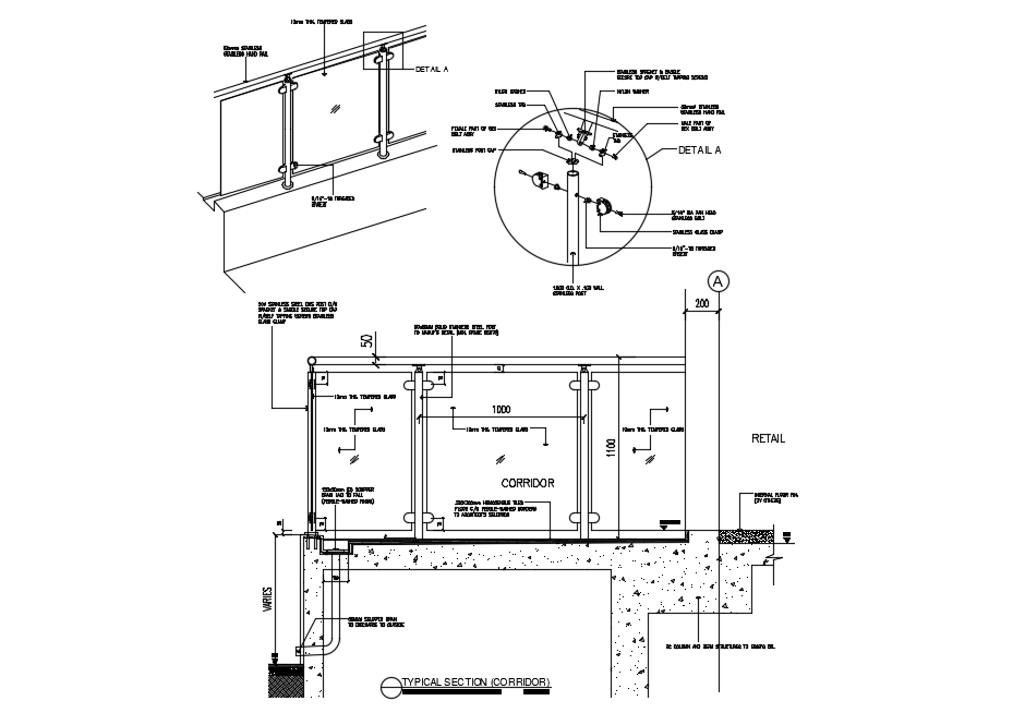 Glass railing section dwg file. Layout plan along of furniture detailing, foundation plan, structure plan.