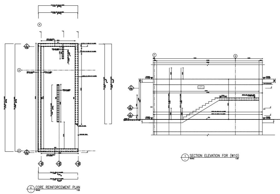 structural detail plan with section and elevation working plan and detail of reinforcement, column and beam detail. shown centre line and section line.