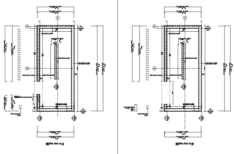 working plan and detail of reinforcement, column and beam detail. shown centre line and section line.