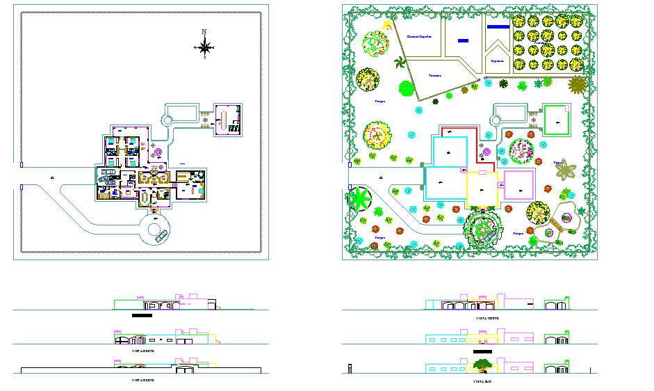 The project further includes front, rear, and side elevation drawings showing building height, façade treatment, roof lines, and external finishes. The surrounding landscape plan features trees, shrubs, plantation areas, fencing layout, pathways, and site orientation. The design ensures proper ventilation, natural light distribution, and balanced space utilization suitable for a modern single-family residence. These architectural drawings are ideal for architects, builders, interior designers, and planners looking for ready-to-use reference material or conceptual inspiration for residential development.