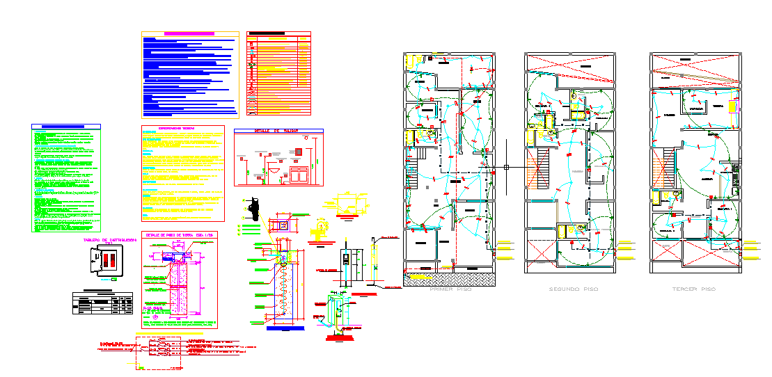 The second and third-floor layouts provide clear light point mapping, appliance outlets, distribution box placement, and staircase illumination design. The file also contains technical notes, legends, installation instructions, and schematic diagrams that explain switch functions, control circuits, and safety systems. Measurement annotations, cable routing directions, and mounting heights are clearly indicated to ensure accurate on-site implementation. This complete electrical layout is ideal for planning residential lighting systems with clarity and precision.