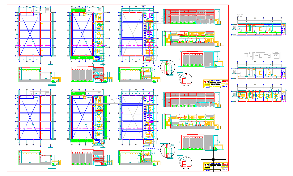 Additionally, the file includes complete elevation drawings, section views, electrical layouts, façade detailing, and material references. The façade elevation illustrates window spacing, roof height, frame proportions, and external wall composition. The section plans indicate vertical circulation, HVAC zones, lighting routes, and internal wall thickness. Construction detailing like foundation depth, column reinforcement position, slab edges, and roof drainage lines are also featured, helping architects, builders, and engineers use the drawing for real site execution. This plan is an excellent reference for professionals developing municipal offices, corporate spaces, or commercial buildings with precise architectural and structural clarity.