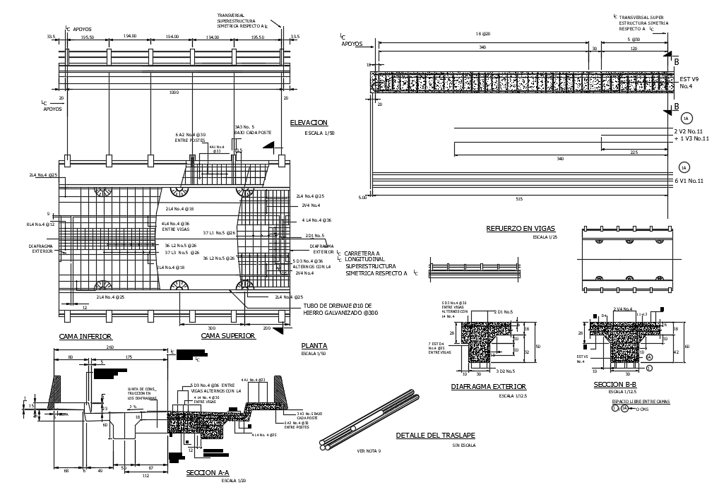 Vehicular bridge layout plan dwg file. structural detail plan with section and elevation working plan and detail of ,column and beam detail. shown centre line and section line.