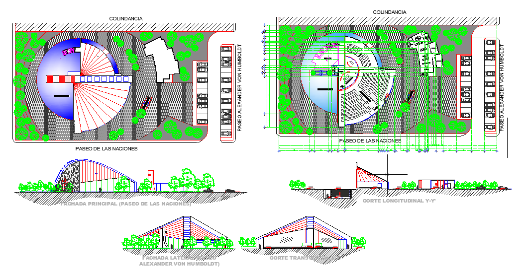 This government office building design features a distinctive circular master layout surrounded by landscaped green areas, pedestrian pathways, and structured vehicular circulation routes. The site plan includes a central auditorium footprint, radial seating arrangements, peripheral service blocks, and an organized parking strip with designated bays aligned along the eastern boundary. The primary frontage opens toward Paseo de las Naciones, while the secondary approach aligns with Alexander Von Humboldt Street. The ground design integrates curved retaining edges, multiple tree clusters, and clearly defined access ramps that accommodate both public entry and service movements.