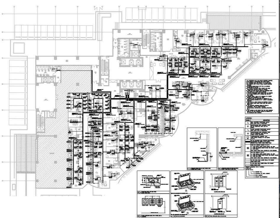 IP system layout of the commercial building.Installation detail for rj45 outlet through under finished floor to a cabinet. Installation.installation detail for cable trunk under raised floor. floor box detail. typical installation detail for data rack. IP system racks front view and side view.