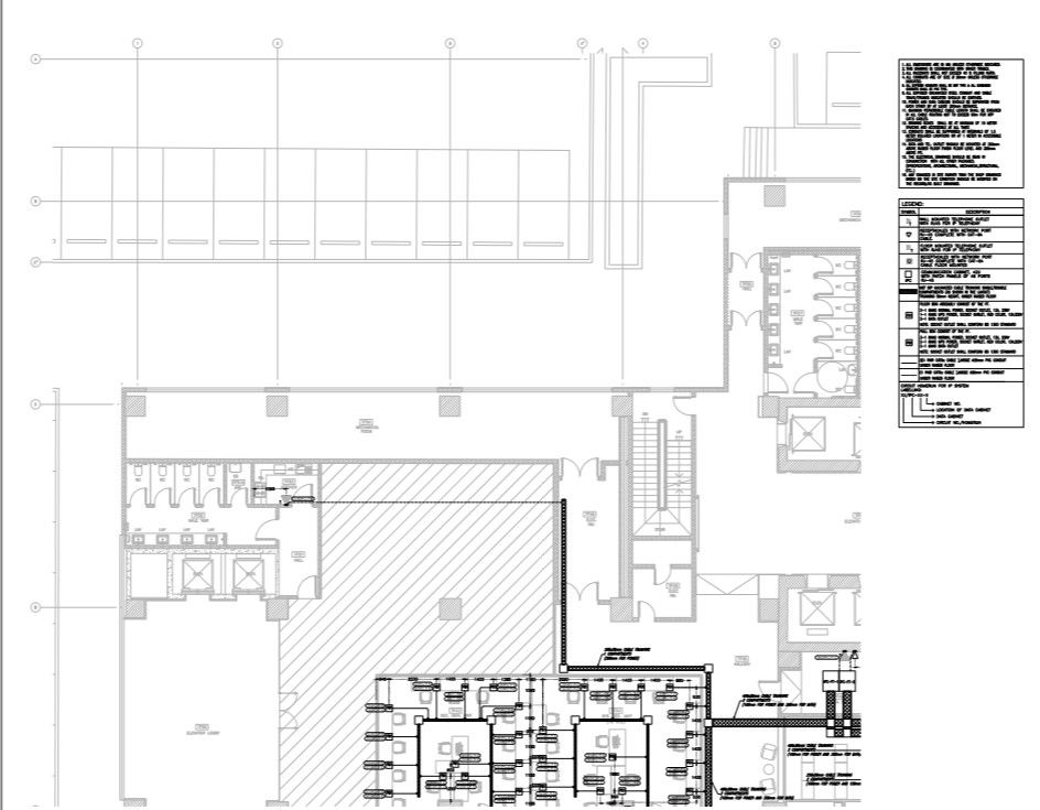 Corporate building IP system layout.with all description of legends and detail. giving detail of IP system racks and installation detail. Working plan including measurements and levels of detail.